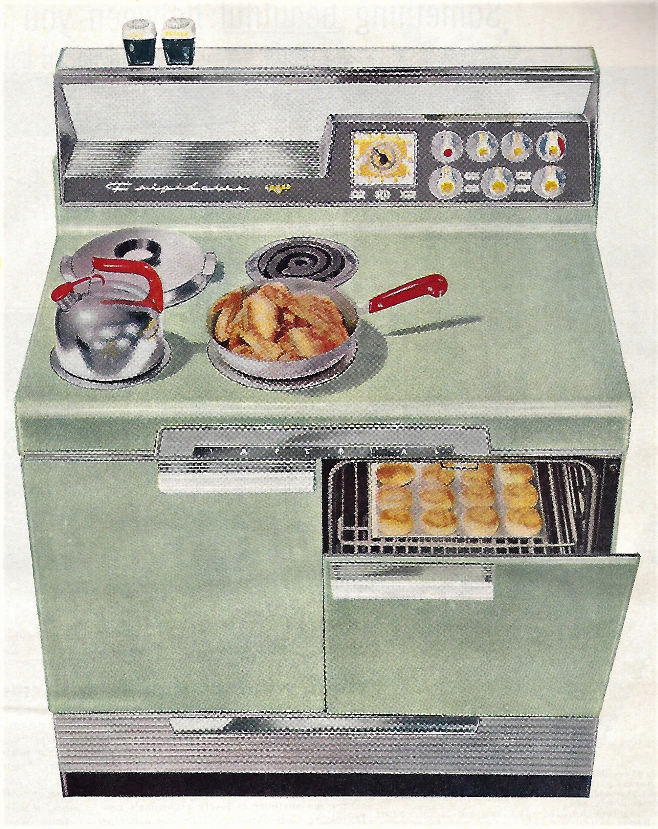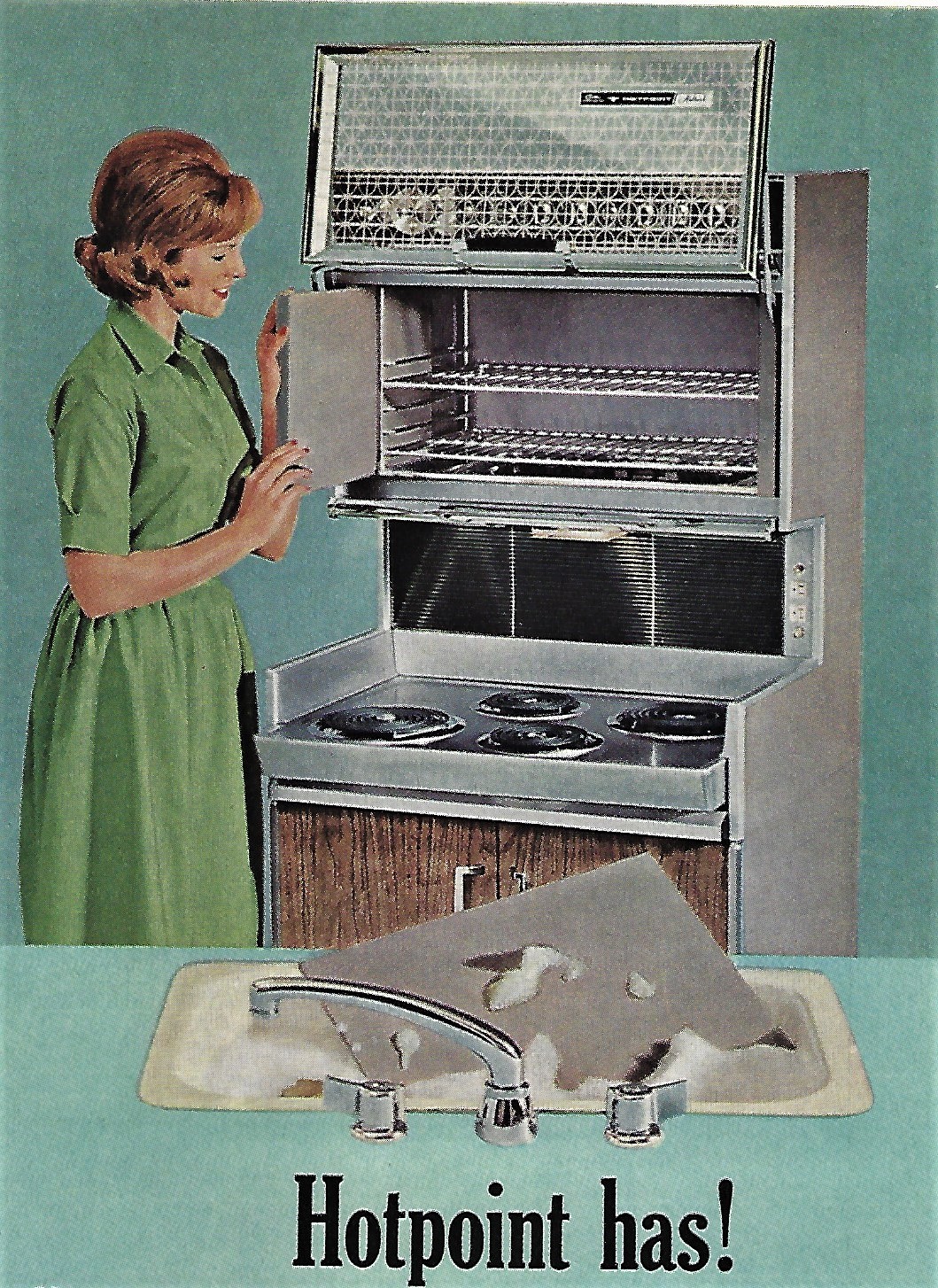 The purchase of a large appliance was for more than just its function. Like a car it was to impress the neighbors and family. New appliances popped up regularly such as the dishwasher, electric can opener, ice crusher, countertop rotisserie oven, popcorn popper and much more. Existing appliances got new features. Refrigerators and stoves got more capacity, timers, ice makers, swing out shelves and defrosters. Ronald Reagan as a spokesman for GE stated “progress is our most important product”. Vice President Nixon in a “Kitchen Debate” with Russian leader Nikita Krushchev spoke of American kitchens filled with the latest automatic devices. Krushchev had little to counter.