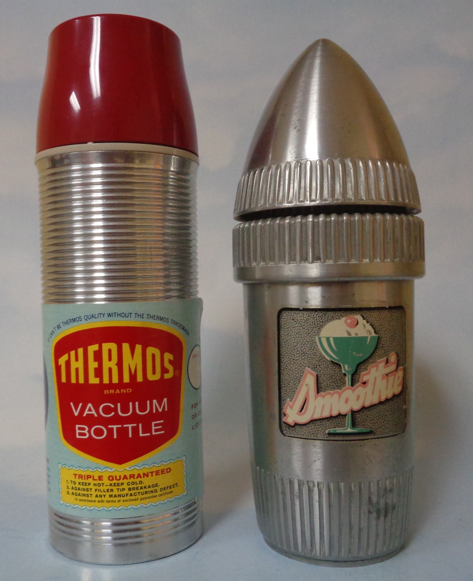 The Thermos is dated 1959. The torpedo shaped Smoothie canister is by Ralmac of Grand Rapids.