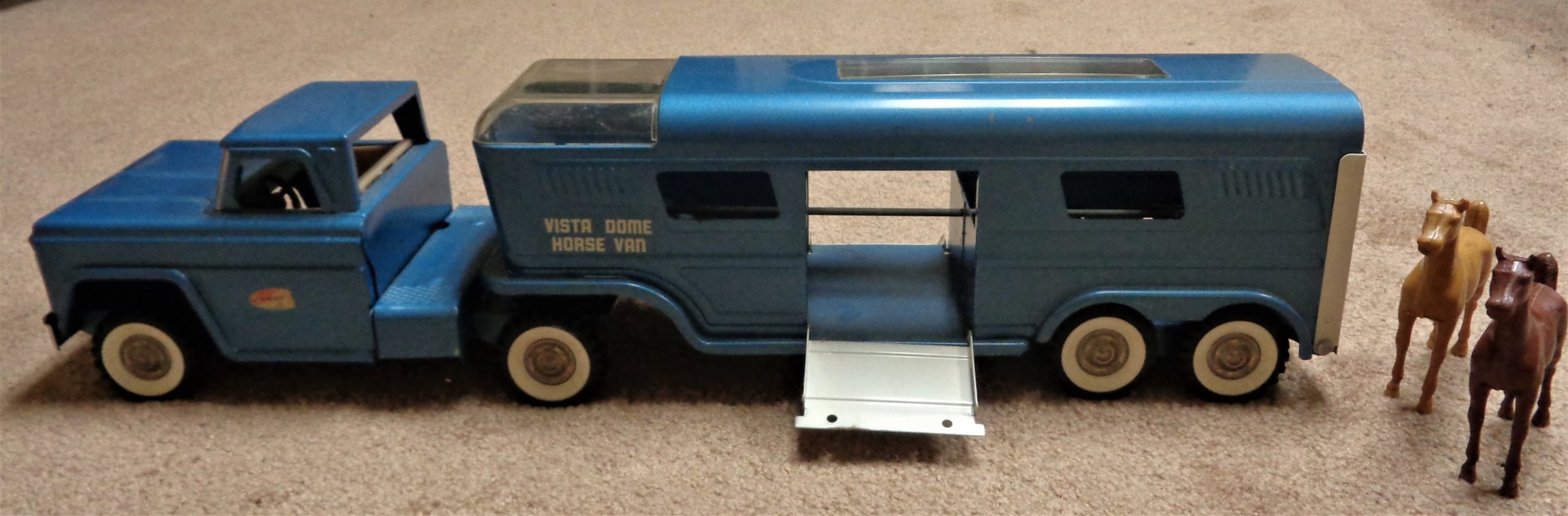 Structo Vista Dome Horse Van. This diecast steel truck is 23 1/2" long and came with 4 plastic horses. By Structo Toys of Freeport, IL.