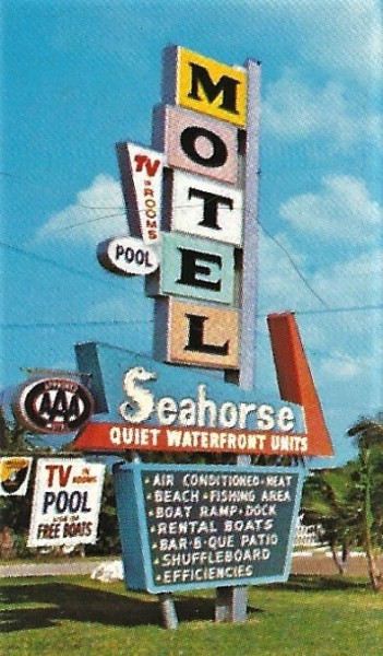 Seahorse Motel on Highway 1 in Marathon, FL. Private beach. Closed. Postcard.